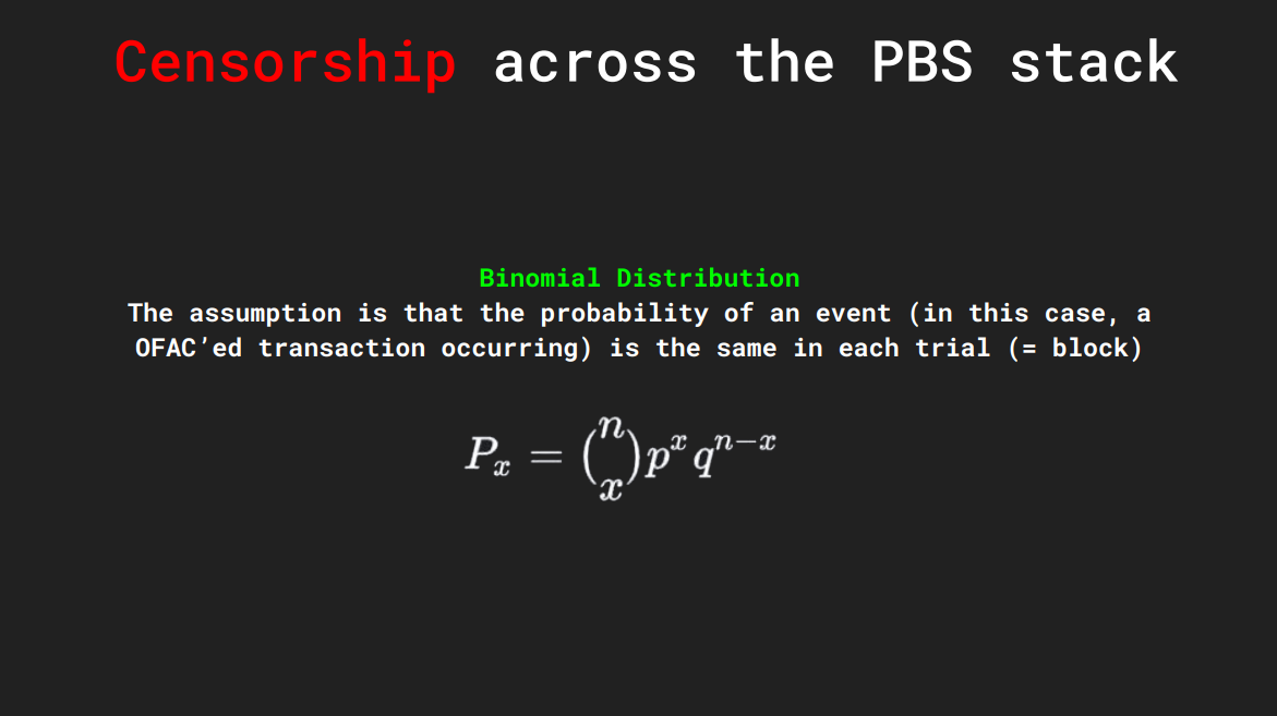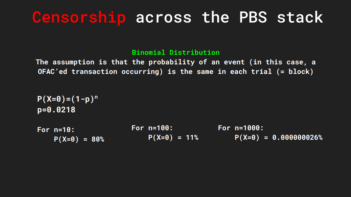 Par exemple, 10 blocs sont un échantillon trop petit, mais 1000 blocs sans contenu OFAC indiquent une censure probable. Depuis le Merge, 2.18% des blocs ont contenu du contenu sanctionné par l'OFAC.