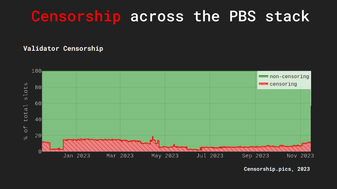 Même si les validateurs se connectent à des relais non censeurs, le taux élevé de constructeurs censeurs signifie qu'ils obtiennent encore souvent des blocs censurés.