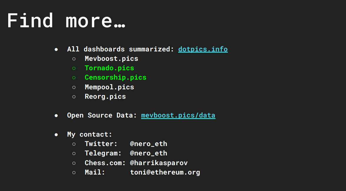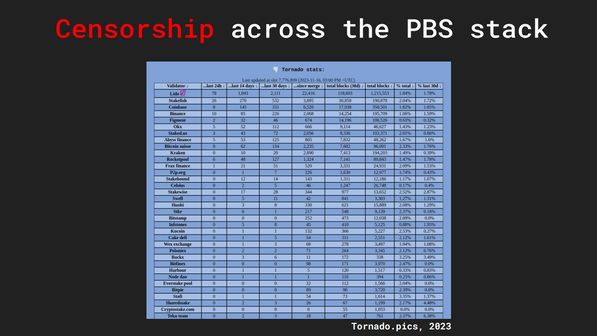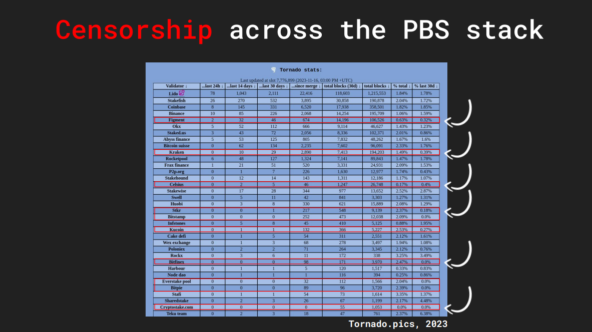 Tornado.pics montre des statistiques sur les validateurs, incluant / excluant les transactions Tornado Cash. Les validateurs avec des taux d'inclusion de transactions OFAC très faibles qui indiquent probablement une censure comprennent : Figment, Kraken, Celsius, Stkr, Bitstamp, Kucoin, Bitfinex, Everstake pool, Bitpie et cryptostake.com.