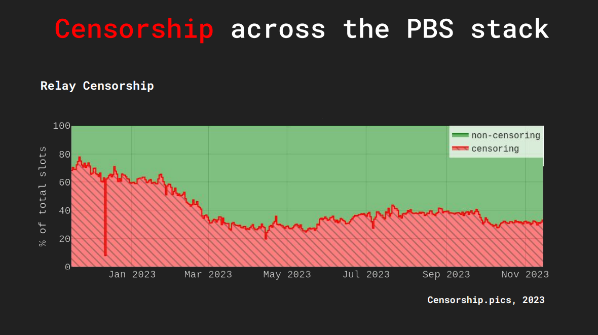 Les relais ont gagné en importance lors du Merge, Flashbots étant le relais censeur dominant au départ. Au début de cette année, environ 80% des blocs relayés étaient censurés en raison de la dominance de Flashbots.