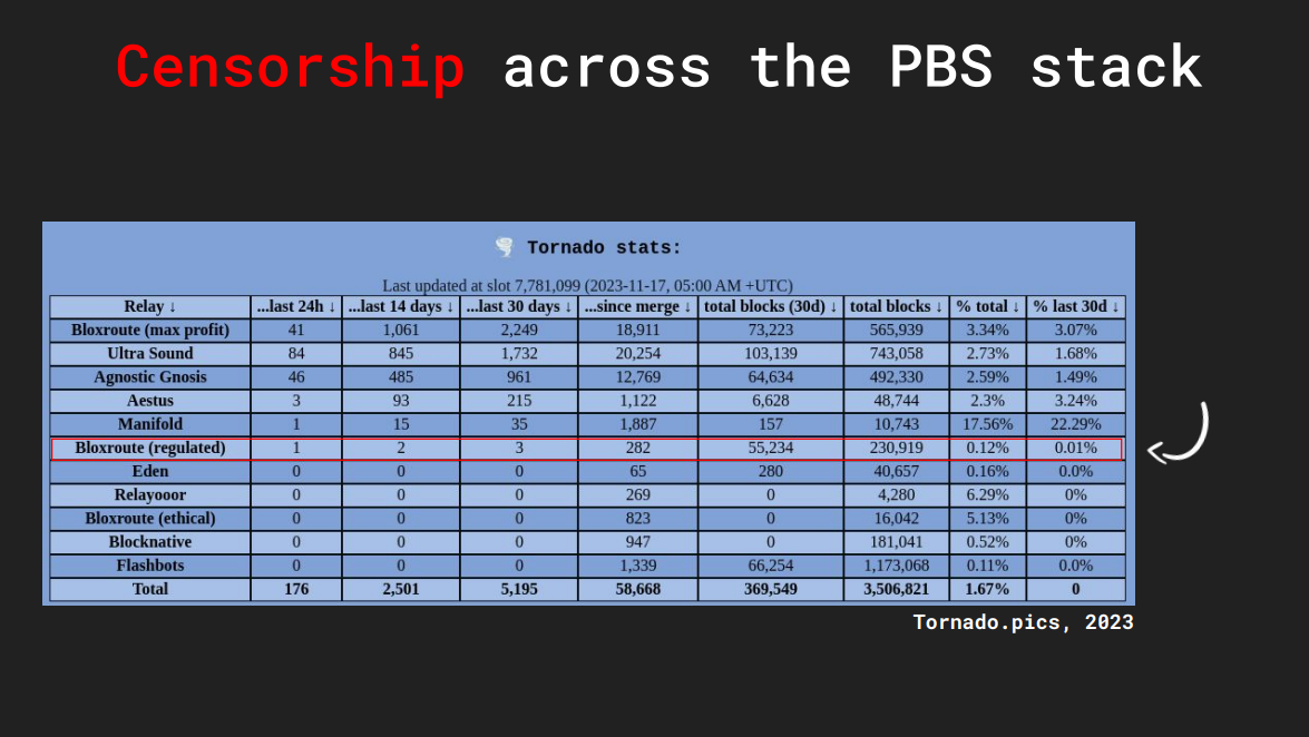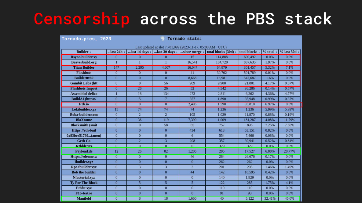 Certains ont commencé à censurer seulement récemment. Les constructeurs non censeurs comme Payload et Moneyfold ont des taux d'inclusion de transactions Tornado Cash élevés, autour de 28-50%.