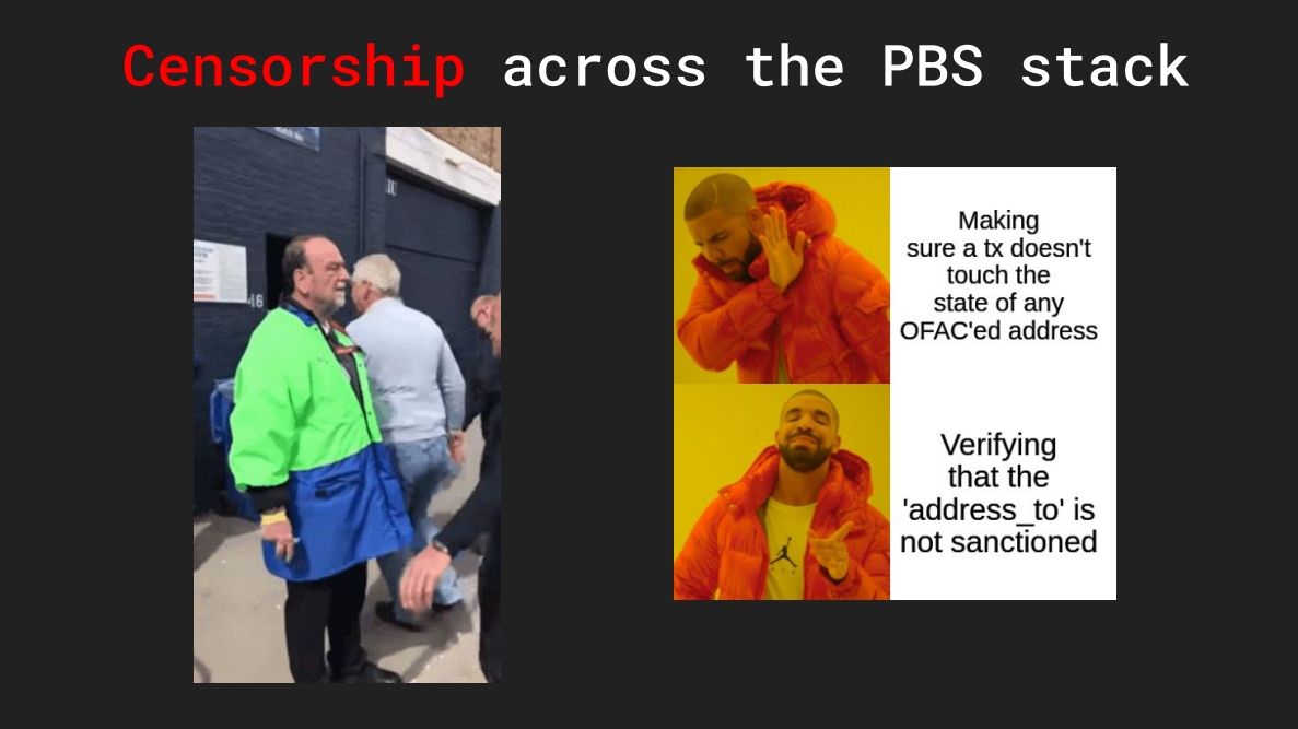 Actuellement, 5 entités (Lido, Stakefish, Coinbase, Kraken, Figment) pourraient obtenir plus de 30% du staking. S'ils déclaraient publiquement qu'ils annuleraient le contenu OFAC, les validateurs rationnels censureraient probablement de façon préventive pour éviter d'être réorganisés.