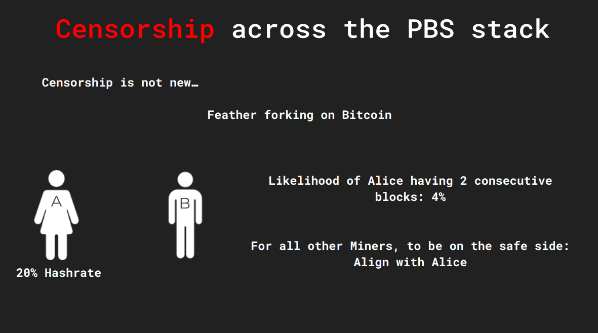 Avec 20% de hashrate, Alice a 4% de chances de produire deux blocs consécutifs pour reorganiser les autres. Sachant cela, d'autres mineurs sont incités à censurer également les transactions de Bob, pour éviter d'être reorganisés par Alice.
