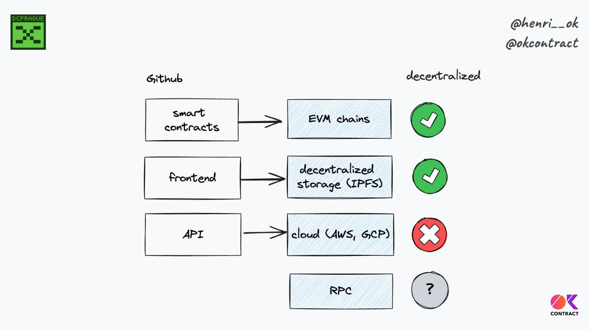 Pour ce qui est des frontends, on prend un grand code source, on le génère pour produire des artefacts, et on stocke ces artefacts sur IPFS de manière décentralisée. Cependant, en y regardant de plus près, ces artefacts contiennent toujours des liens vers des services centralisés comme des API s'exécutant sur AWS (Amazon Web Services).