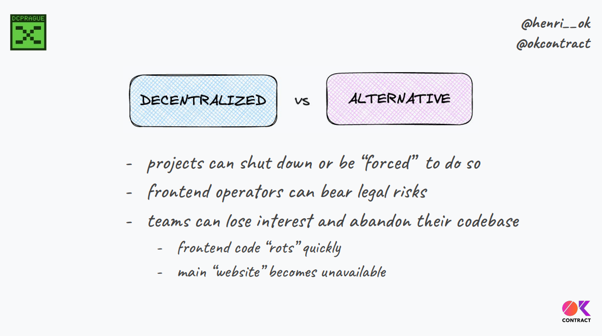 Par ailleurs, bien que les artefacts des frontends soient eux-mêmes décentralisés sur IPFS, ils dépendent toujours de services centralisés traditionnels, contrecarrant ainsi une partie de l'objectif d'une véritable interface web décentralisée.