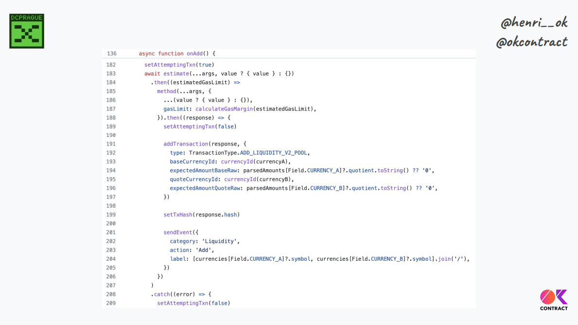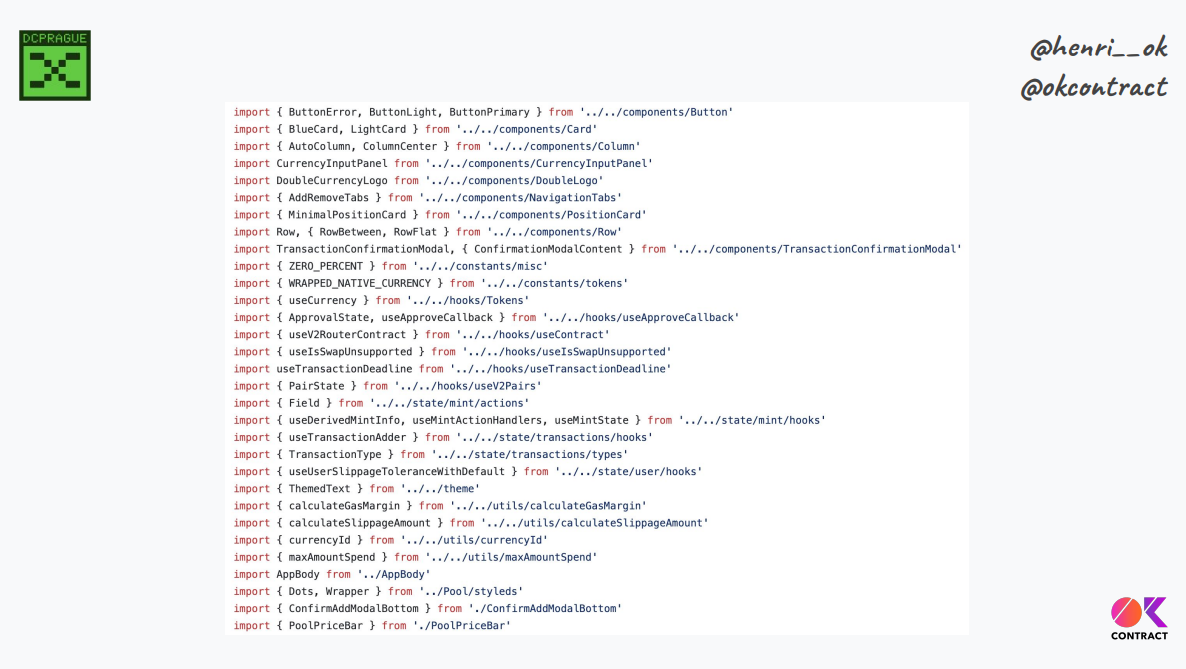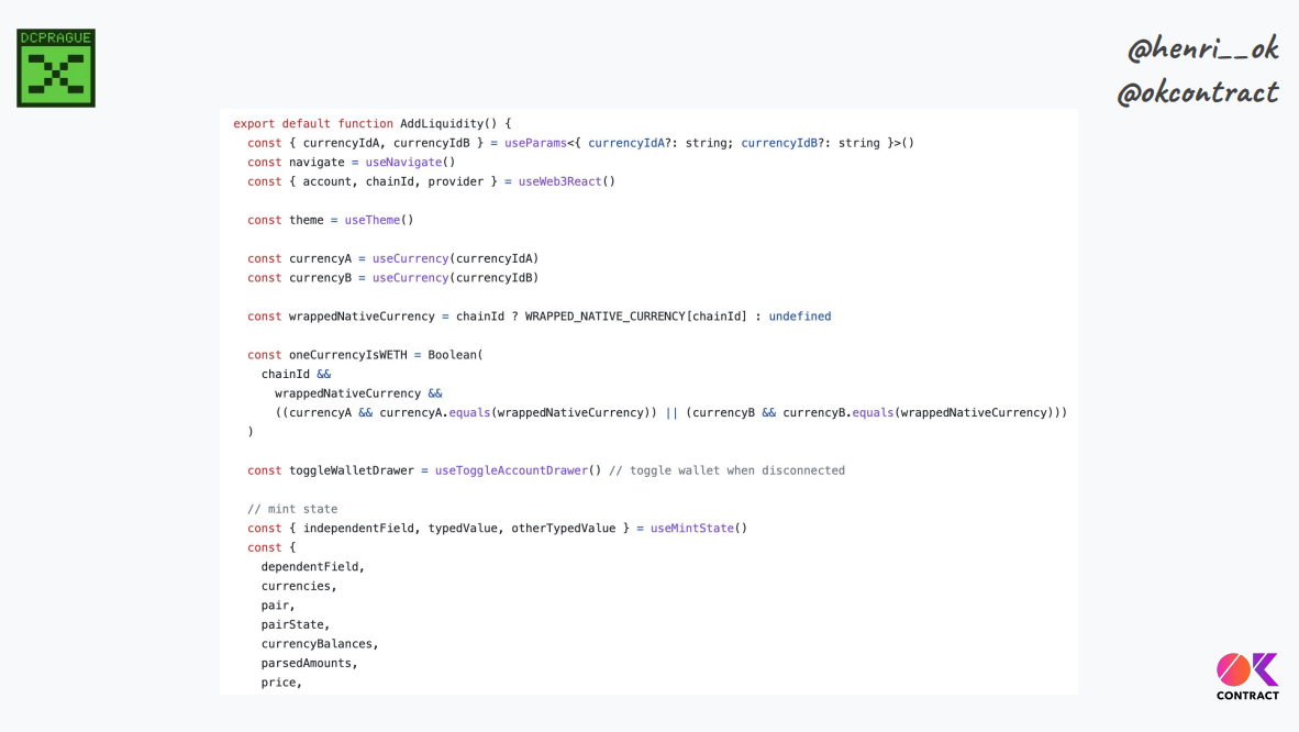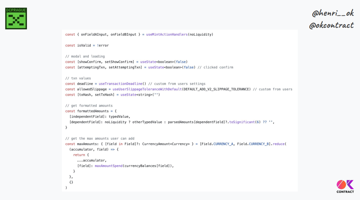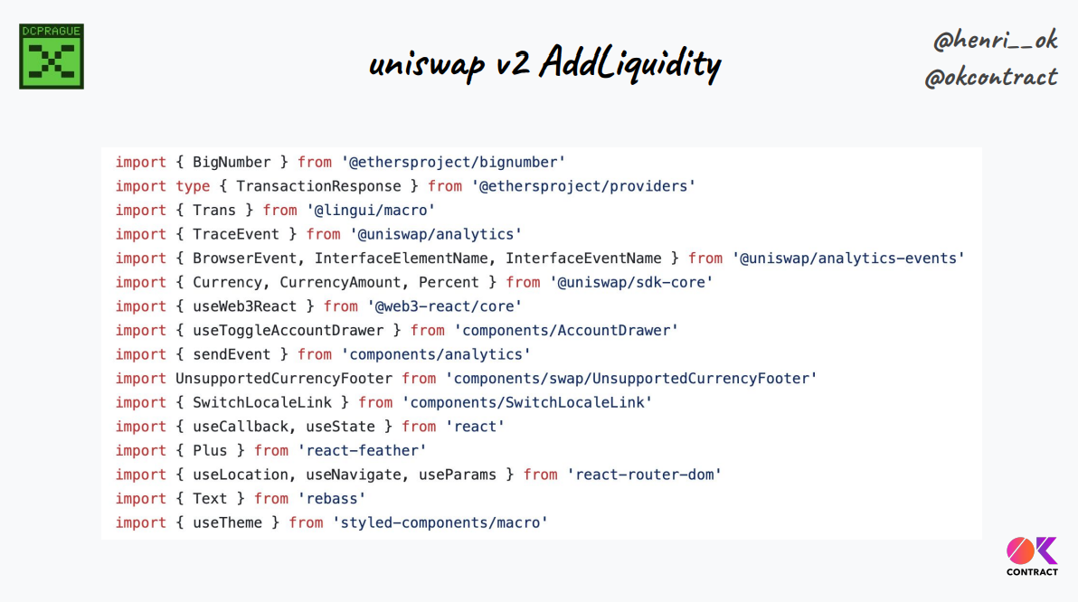 La page "ajouter de la liquidité" d'Uniswap contient plus de 500 lignes de Javascript, sans compter le nombre de bibliothèques différentes, de composants SDK, de hooks, etc. Si on les inclut tous, on a des milliers de lignes de code juste pour construire une interaction.