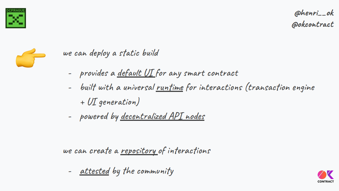 Nous pouvons déployer ces constructions statiques qui peuvent fournir des interfaces alternatives par défaut utilisant l'interface générée et le runtime universel et ainsi décentraliser les nœuds API.