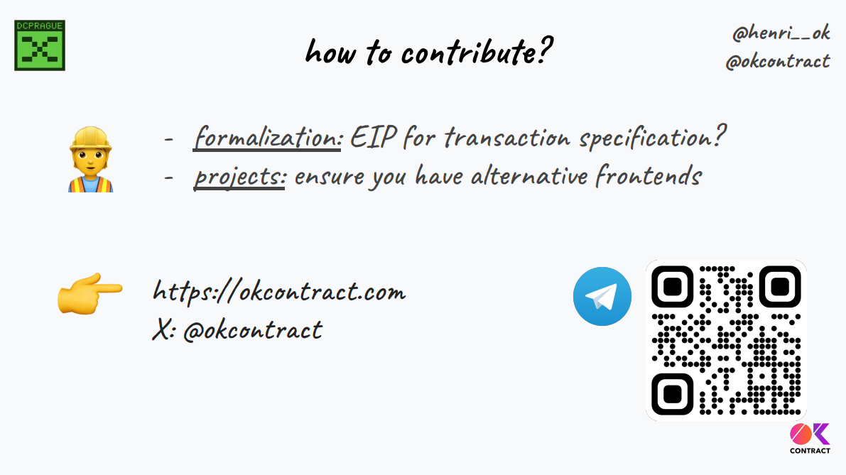 Les projets peuvent contacter OKContract pour rejoindre la version bêta privée, et l'orateur peut être contacté via Twitter ou le nouveau groupe Telegram pour contribuer ou s'impliquer.