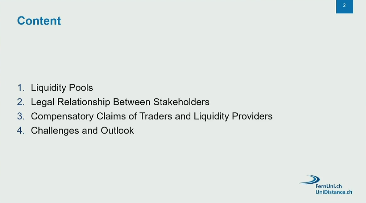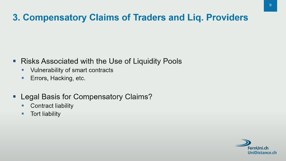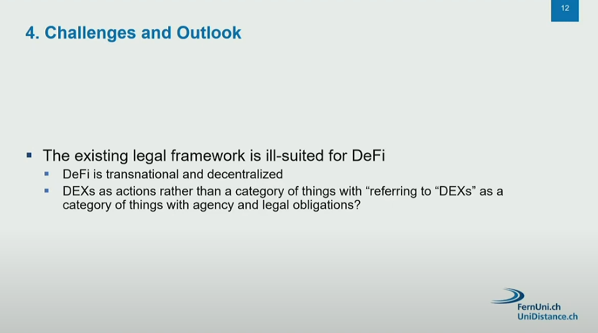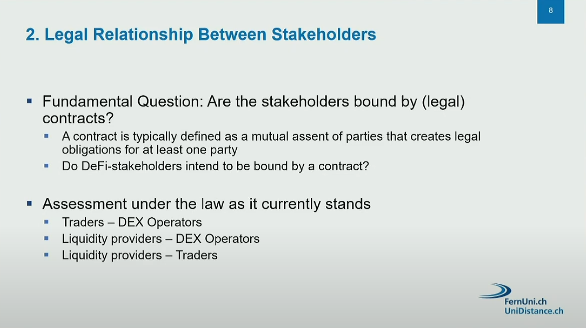 The presentation addressed the contractual relationships between traders, liquidity providers, and DEX operators, but did not cover AML (anti-money laundering) regulations or criminal liability aspects.