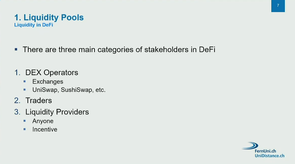 Stakeholders in liquidity pools are operators of the DeFi platforms/interfaces, traders and liquidity providers