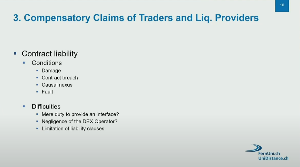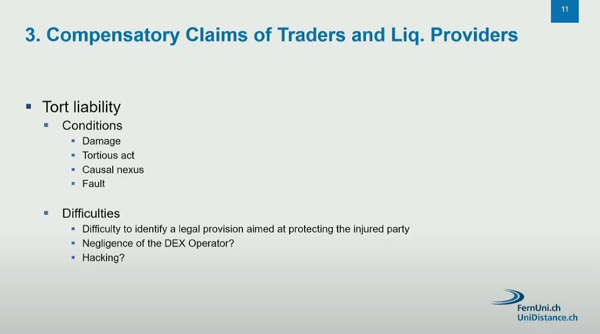 Under current Swiss law, it is very difficult for users to obtain compensation from DEX operators due to :