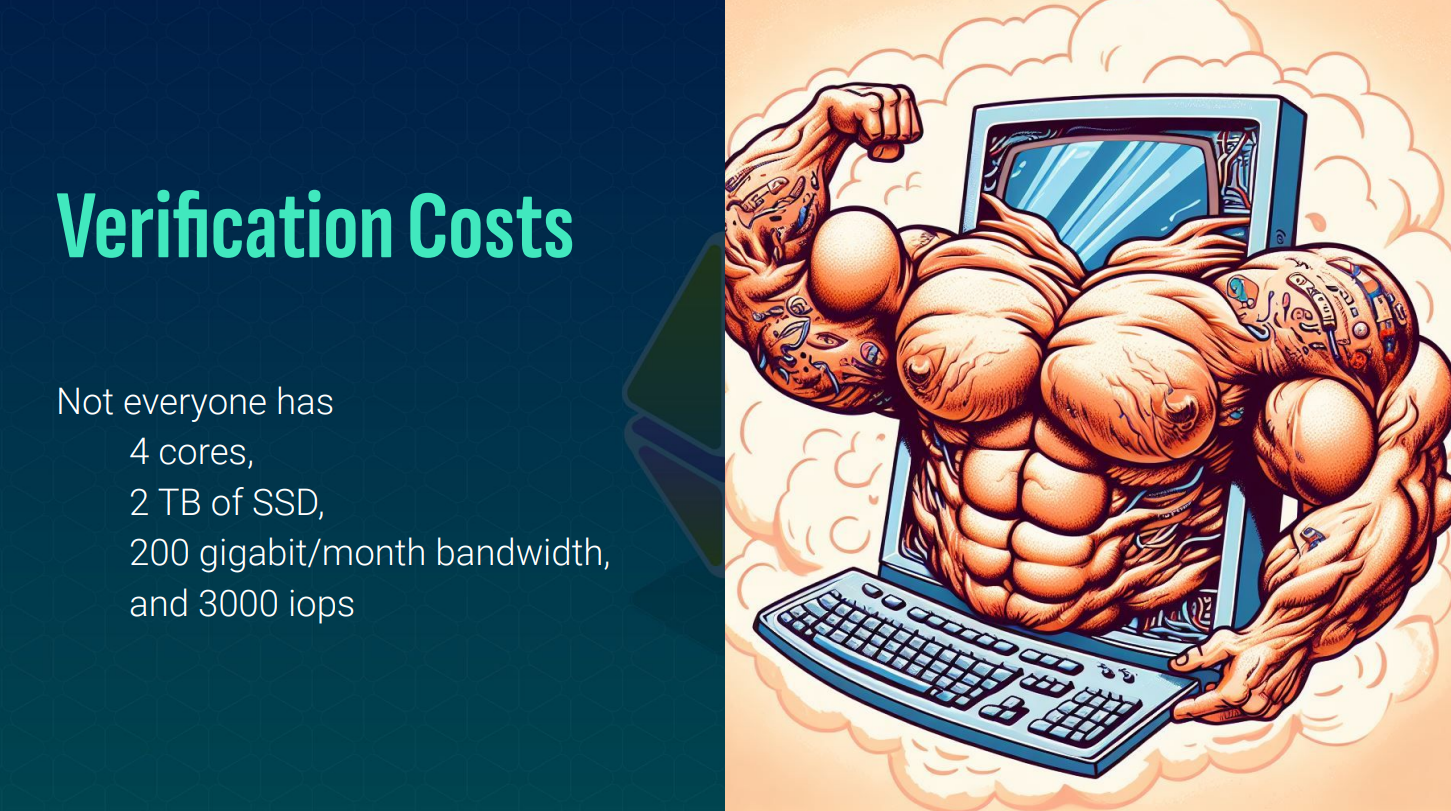 - To verify on-chain payments, execute contracts, or validate transactions, you need to run computationally-intensive nodes. This requires expensive hardware that average people can't afford.