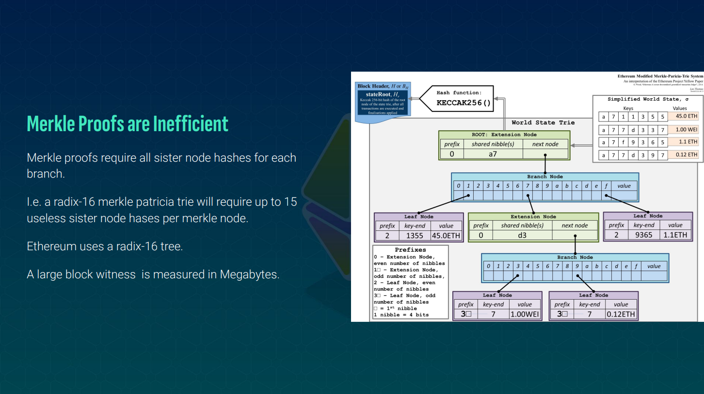 Current Merkle Patricia trees have large block proofs (1-2 MB), making this solution not currently feasible for global scale.