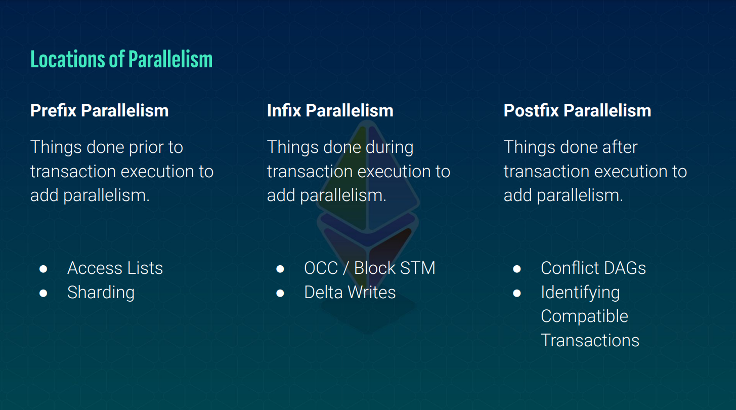 There are 3 main areas where introducing parallel processing could help scale Ethereum: