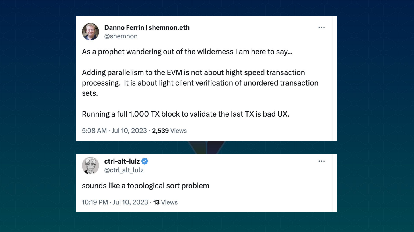 - Prefix Parallelism : Adding extra data to transactions before submitting them that enables more parallel processing afterwards. Like flags saying what data will be accessed.